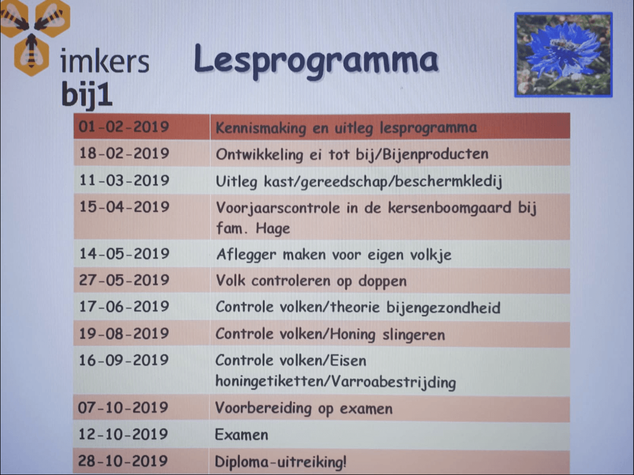 Hieronder volgt de schitterende presentatie verzorgd door Karin en Ankie van het cursisten team. Zij vertellen aan de hand van beelden wat het inhoud om een opleiding tot imker te krijgen en hoe dit in zijn werk gaat.